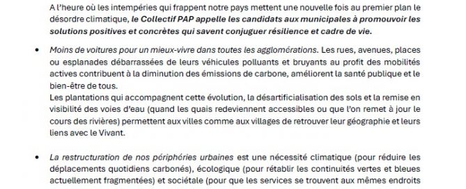Candidats aux prochaines élections municipales, mettez le cadre de vie et le paysage au centre de vos programmes ! A l’heure où les intempéries qui frappent notre pays mettent une nouvelle fois au premier plan le désordre climatique, le Collectif PAP appelle les candidats aux municipales à promouvoir les solutions [Lire l'article]